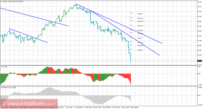Уровни поддержки и сопротивления – красные горизонтальные линии.Материал предоставлен компанией InstaForex - www.instaforex.comТехнический анализ сырой нефти за 5 мая 2017 года