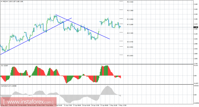 Красная линия и гистограмма с белыми барами в окне индикаторов.Материал предоставлен компанией InstaForex - www.instaforex.comТехнический анализ природного газа за 5 мая 2017 года