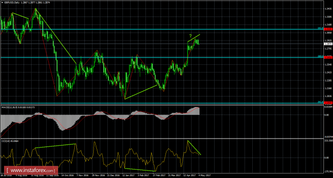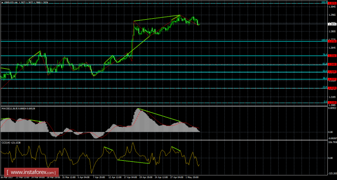 На 24-часовом графике рост котировок может быть продолжен в направлении уровня коррекции 161,8% - 1,3103. 4 мая по-прежнему назревает медвежья дивергенция у индикатора CCI: последний пик котировок уже выше предыдущего, а аналогичный пик индикатора может получиться ниже. Медвежья дивергенция позволит рассчитывать трейдерам на разворот в пользу доллара США и некоторое падения пары. Отбой курса от уровня Фибо 161,8% аналогично сработает в пользу начала падения в направлении коррекционного уровня 200,0% - 1,2653. Закрепление над уровнем коррекции 161,8% повысит шансы на дальнейший рост в направлении следующего уровня Фибо 100,0% - 1,3835.
