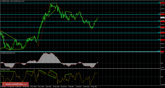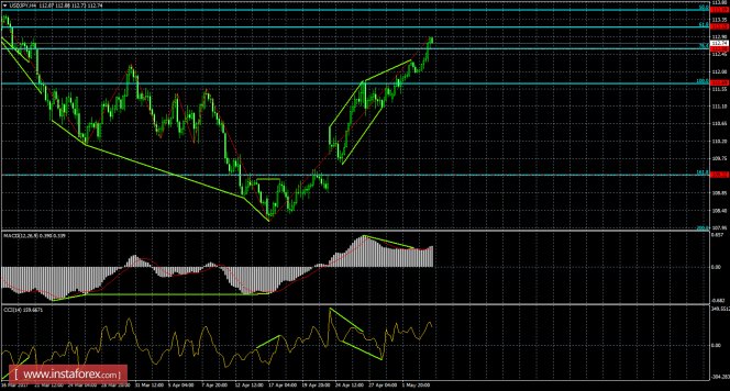 Образовавшаяся медвежья дивергенция позволила паре выполнить лишь небольшое падение котировок, после чего пара выполнила рост и закрепление над коррекционным уровнем 76,4% - 112,58. В итоге 4 мая процесс роста может быть продолжен в направлении следующих уровней коррекции 61,8% - 113,15 и 50,0% - 113,59. Новых назревающих дивергенций сейчас нет. Закрепление курса пары под уровнем Фибо 76,4% позволит трейдерам ожидать разворот в пользу валюты Японии и некоторое падение в направлении уровня коррекции 100,0% - 111,69.