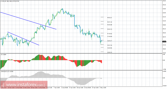 Уровни поддержки и сопротивления – красные горизонтальные линии.Материал предоставлен компанией InstaForex - www.instaforex.comТехнический анализ сырой нефти за 3 мая 2017 года