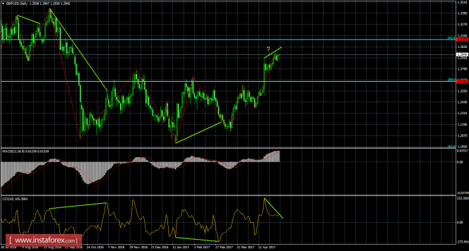 На 24-часовом графике рост котировок также продолжается, в направлении уровня Фибо 161,8% - 1,3103. 3 мая назревает медвежья дивергенция у индикатора CCI: последний пик котировок уже выше предыдущего, а аналогичный пик индикатора может получиться ниже. Медвежья дивергенция позволит ожидать разворот в пользу американской валюты и некоторое падения пары. Отбой курса от уровня коррекции 161,8% аналогично сработает в пользу начала падения в направлении уровня Фибо 200,0% - 1,2653. Закрепление пары над уровнем коррекции 161,8% повысит вероятность дальнейшего роста в направлении коррекционного уровня 100,0% - 1,3835.