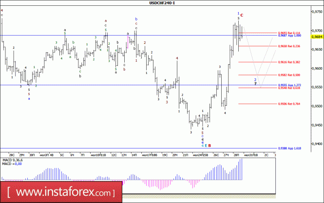 В целом ожидаемо, пятничные торги пара USD/CHF начала с восходящего движения и уже в середине дня пробила уровень 97-й фигуры. При этом 1-я волна, в составе будущей волны С, приняла вид вполне завершенной пяти-волновой структуры. Если это так, то от достигнутого в последний день минувшей недели максимума валютная пара может начать коррекционное снижение к отметке 0,9550 (или даже к уровню 0,9500), обозначив тем самым начало будущей 2-й волны, в С.