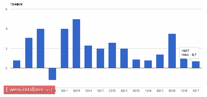 Согласно первой предварительной оценке, экономика США в 1-м квартале продемонстрировала самый слабый рост за последние несколько лет. Министерство торговли США опубликовало данные, согласно которым валовой внутренний продукт в 1-м квартале текущего года вырос на 0,7% годовых, тогда как в 4-м квартале 2016 года рост составил 2,1%. Экономисты ожидали, что рост ВВП в 1-м квартале составит 1%.