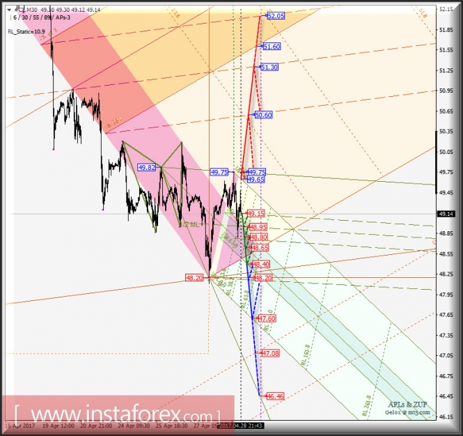 Развитие движения цены инструмента (#CL) в период 01_03 мая 2017 г. будет обусловлено отработкой уровня сопротивления 49.65 (начальная линия SSL вил операционного масштаба Micro) и уровня поддержки 49.15 (верхняя границ канала 1/2 Median Line Micro Micro).