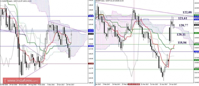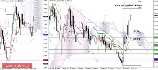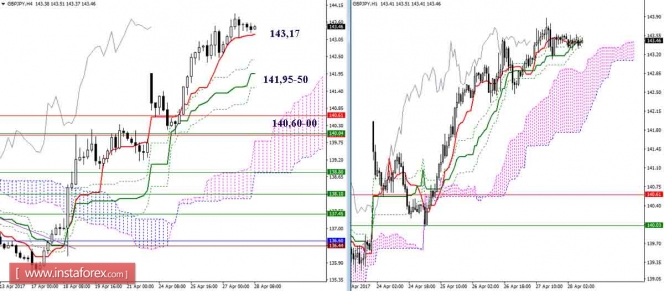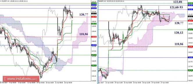 Валютная пара продолжает построение восходящего набора волн. Если это предположение верно, то повышение котировок возобновится в рамках волны с, в с, в с, в E, в (B) с целями, расположенными выше расчетной отметки 1,0969, что соответствует 261,8% по Фибоначчи. Предположительно, в рамках коррекционной волны b, в с , в с, в E, в (B) понижение котировок началось с целями, находящимися около отметок 1,0805 и 1,0760, что соответствует 38,2% и 50,0% по Фибоначчи.Материал предоставлен компанией InstaForex - www.instaforex.comДневной обзор GBP/JPY и EUR/JPY на 28.04.17. Индикатор Ишимоку