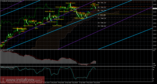На 15-минутном графике рекомендуется рассматривать ордера на покупку с целью 144,31 при закреплении цены выше 143,28 (Тенкан-сен), ордере Stop Loss ниже 143,26 и при направленном вверх индикаторе MACD.