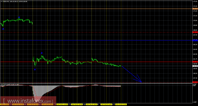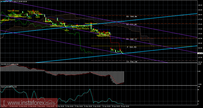 На младшем графике рекомендуется рассматривать ордера на продажу с целью 156,20 при открытии ниже 161,06 (Тенкан-сен), ордере Stop Loss выше 161,06 и при направленном вниз MACD.