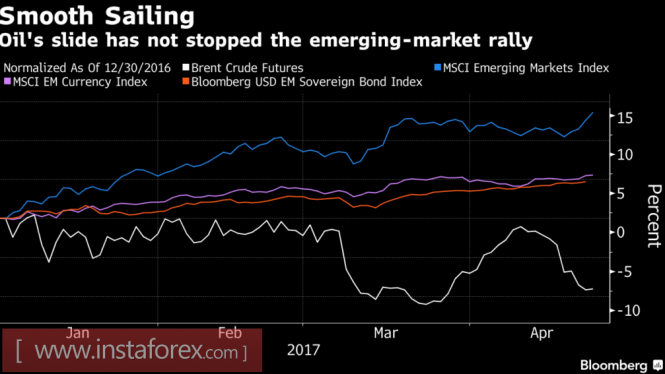 Таким образом, дома рубль не жалуют, а вот за пределами страны на него по-прежнему смотрят с интересом. Несмотря на то что «россиянин» уступил вторую строчку в списке лучших исполнителей среди более чем трех десятков наиболее ликвидных валют, отслеживаемых Bloomberg, польскому злотому, он все еще удерживает место в тройке, подчиняясь общей тенденции денежных единиц развивающихся стран. А она такова, что, игнорируя существующие риски (UBS, Goldman Sachs и другие банки предупреждают, что политическая нестабильность, торговый протекционизм и потенциальное снижение цен на сырьевые товары угрожают валютам EM), они продолжают укрепляться.