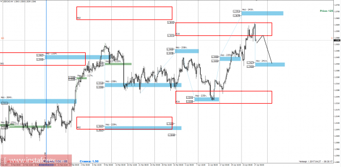 2017-04-27 09:39:20 (читать в оригинале)На текущей неделе пара достигла месячной КЗ апреля 1.3642-1.3572, что привело к появлению крупного предложения и остановке роста. Формирование разворотной модели на младшем таймфрейме позволит рассматривать продажи к минимум текущей недели.