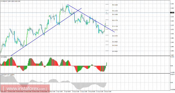 Красная линия и гистограмма с белыми барами в окне индикаторов.Материал предоставлен компанией InstaForex - www.instaforex.comТехнический анализ природного газа за 27 апреля 2017 года