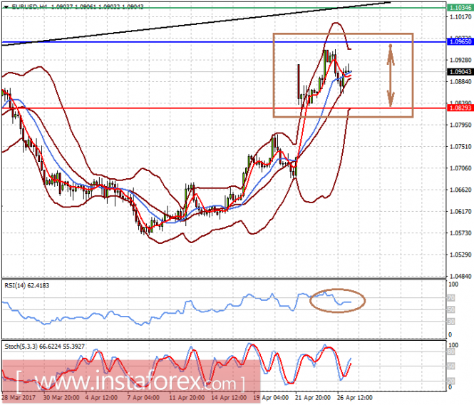 Пара EURUSD консолидируется в ожидании итогов заседания ЕЦБ по денежно-кредитной политике, от которого ничего нового рынки не ждут. В то же время важным фактором ее стабилизации является ожидание рыночными игроками второго тура президентских выборов во Франции, который состоится 7 мая. Вероятно, что сегодня пара останется в диапазоне 1.0830-1.0965.