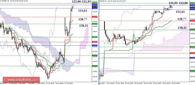 Валютная пара продолжает построение восходящего набора волн. Если это предположение верно, то повышение котировок может продолжиться в рамках волны а, в с, в с, в E, в (B) с целями, расположенными около расчетной отметки 1,0969, что соответствует 261,8% по Фибоначчи, и выше около 10 фигуры. В рамках коррекционной волны после завершения а, в с , в с, в E, в (B) понижение котировок может начаться с целями, находящимися около отметок 1,0851 и 1,0814, что соответствует 161,8% и 127,2% по Фибоначчи.Материал предоставлен компанией InstaForex - www.instaforex.comДневной обзор GBP/JPY и EUR/JPY на 26.04.17. Индикатор Ишимоку