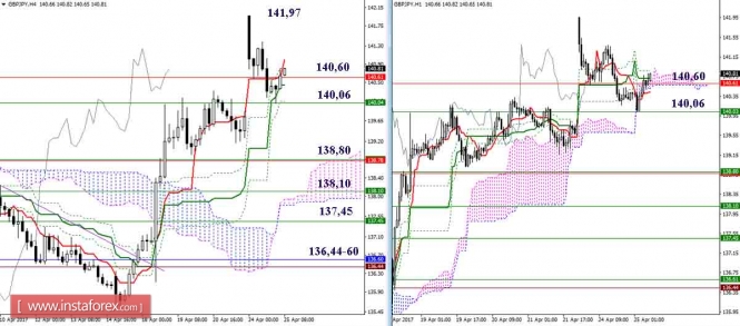 В сложившейся ситуации ключевое значение имеют уровни поддержки дневного облака 140,60-06, которые сейчас объединили свои усилия с некоторыми уровнями Ишимоку Н4 и Н1 (кресты + облако Н1). Работа пары выше данных поддержек увеличивает преимущества игроков на повышение, первостепенной задачей при этом становится возврат на высоты открытия недели (141,97). Закрепление ниже 140,06 открывает дорогу для ретеста пройденных накануне уровней 138,80 – 138,10 – 137,45 – 136,44-60.