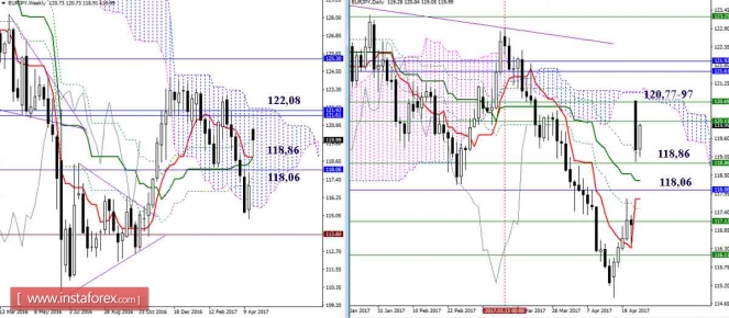 Уровни, сопротивление которых удалось преодолеть с помощью гэпа, сейчас превратились в усиленную зону поддержек (118,86 недельный крест + дневной Фибо Киджун + 118,06 дневной крест + месячный Тенкан). В настоящий момент они помогают игрокам на повышение отстаивать свои интересы. Основной задачей для игроков на повышение по-прежнему является продолжение подъёма через дневное облако (120,77-97) к верхней границе недельного облака (122,08).