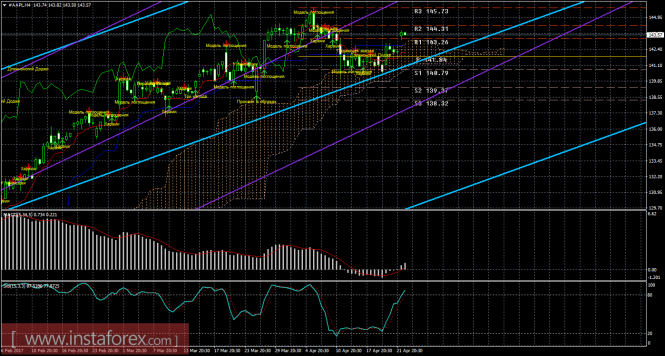 Индикатор MACD – красная линия и гистограмма с белыми барами в окне индикаторов.Материал предоставлен компанией InstaForex - www.instaforex.comДневной обзор GBP/JPY и EUR/JPY на 25.04.17. Индикатор Ишимоку