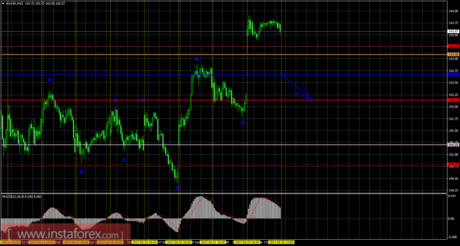 На 15-минутном графике рекомендуется рассматривать ордера на продажу с целью 142,13 (Тенкан-сен) при закреплении цены ниже 142,66 (Киджун-сен), ордере Stop Loss выше 142,66 (Киджун-сен) и при направленном вниз индикаторе MACD.