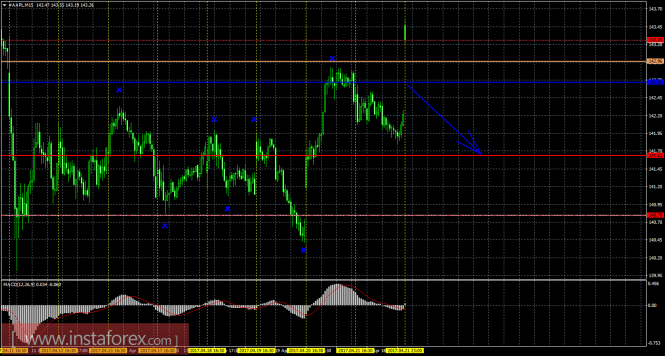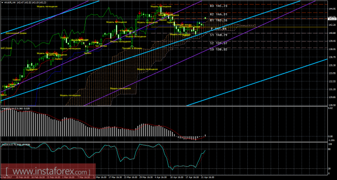 На 15-минутном графике рекомендуется рассматривать ордера на продажу с целью 141,63 (Тенкан-сен) при закреплении цены ниже 142,66 (Киджун-сен), ордером Stop Loss выше 142,66 (Киджун-сен) и при направленном вниз индикаторе MACD.