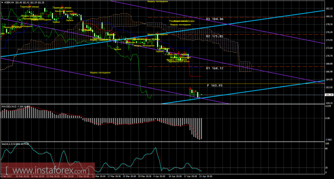 На младшем графике рекомендуется рассматривать ордера на продажу с целью 156,20 при открытии ниже 165,67 (Тенкан-сен), ордером Stop Loss выше 165,67 и при направленном вниз MACD.
