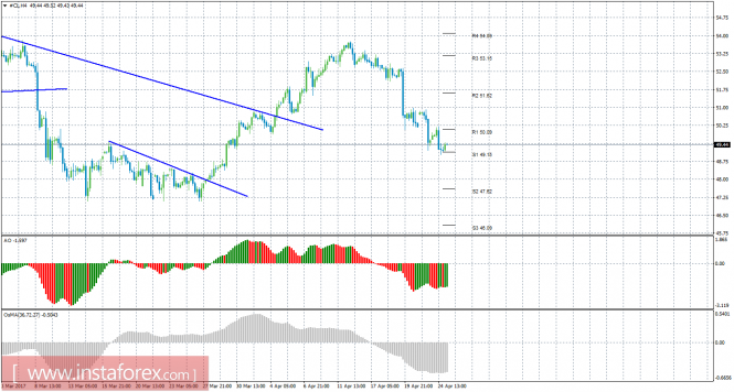 Уровни поддержки и сопротивления – красные горизонтальные линии.Материал предоставлен компанией InstaForex - www.instaforex.comТехнический анализ сырой нефти за 25 апреля 2017 года