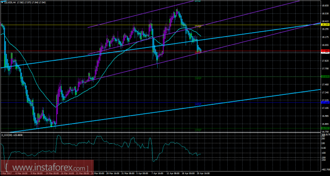 Валютная пара продолжает построение восходящего набора волн. Если это предположение верно, то повышение котировок может возобновиться в рамках волны 5, в с, в E, в (B) с целями, расположенными около расчетной отметки 1,0874, что соответствует 161,8% по Фибоначчи, и выше около 9 фигуры. В рамках новой коррекционной волны 4, в 5, в с, в E, в (B) понижение котировок началось с целями, находящимися около отметок 1,0700 и 1,0651, что приравнивается к 50,0% и 61,8% по Фибоначчи.Материал предоставлен компанией InstaForex - www.instaforex.comТехническая картина инструмента SILVER по системе «Каналы регрессии» за 21 апреля 2017 года