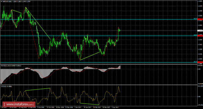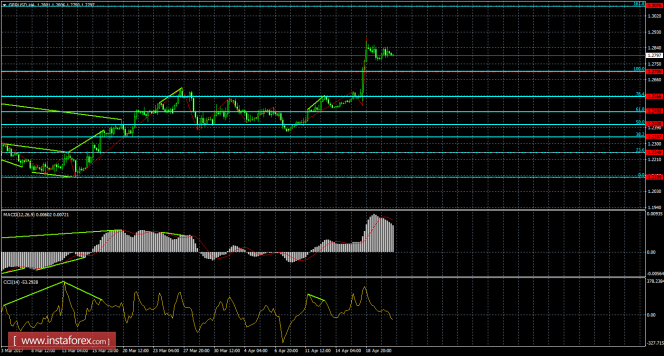 Котировки на 4-часовом графике выполнили закрепление над уровнем Фибо 100,0% - 1,2705, что позволяет рассчитывать на продолжение роста 21 апреля в направлении следующего уровня коррекции 161,8% - 1,3076. Назревающих дивергенций сегодня не наблюдается ни у одного индикатора. Отбой курса пары от коррекционного уровня 161,8% позволит ожидать разворот в пользу американского доллара и некоторое падение в направлении уровня Фибо 100,0%. Закрепление котировок под уровнем коррекции 100,0% аналогично сработает в пользу доллара США.
