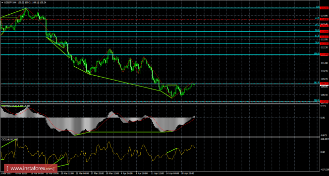 На 4-часовом графике без образования бычья дивергенции котировки выполнили разворот в пользу валюты США и возврат к коррекционному уровню 161,8% - 109,32. Отбой курса пары от уровня Фибо 161,8% позволит трейдерам рассчитывать на разворот в пользу японской иены и некоторое падение в направлении уровня коррекции 200,0% - 107,85. Назревающих дивергенций 21 апреля не наблюдается. Закрепление котировок над уровнем Фибо 161,8% повысит шансы на дальнейший рост в направлении следующего уровня коррекции 100,0% - 111,69.