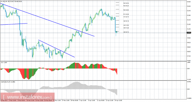 Уровни поддержки и сопротивления – красные горизонтальные линии.Материал предоставлен компанией InstaForex - www.instaforex.comТехнический анализ сырой нефти за 20 апреля 2017 года
