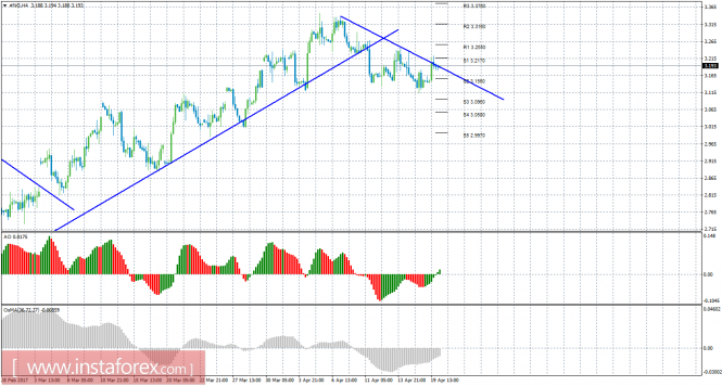 Анализ природного газа за 20 апреля показывает, что цена еще раз скорректировалась к нисходящей линии тренда. На данный момент актуально нисходящее движение с целями уровни поддержки S3 – 3,0960 и S4 – 3,0580, если цена отскочит от линии тренда. Целями для продолжения восходящего движения выступают уровни 3,2170 и 3,2550, если цена преодолеет линию тренда. Построена новая нисходящая линия тренда, которая поддерживает торгующих на понижение и делает актуальными ордера на продажу. Если цена закрепится выше нее, это будет означать смену тенденции на рынке, и вновь станут актуальными длинные позиции. Индикатор Awesome показывает локальное восходящее движение, последний закрытый бар окрашен в зеленый цвет. OsMA также направлен вверх, что сигнализирует о восходящем движении цены на газ и в более долгосрочном плане. Отскок от линии тренда может спровоцировать возобновление движения вниз.