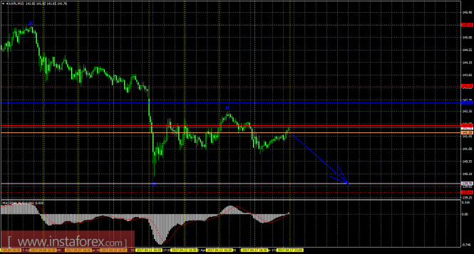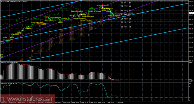 На 15-минутном графике рекомендуется рассматривать ордера на продажу с целью 139,76 (Сенкоу Спан Б) при закреплении цены ниже 141,58 (Сенкоу Спан А), ордере Stop Loss выше 141,83 (Тенкан-сен) и при направленном вниз индикаторе MACD.