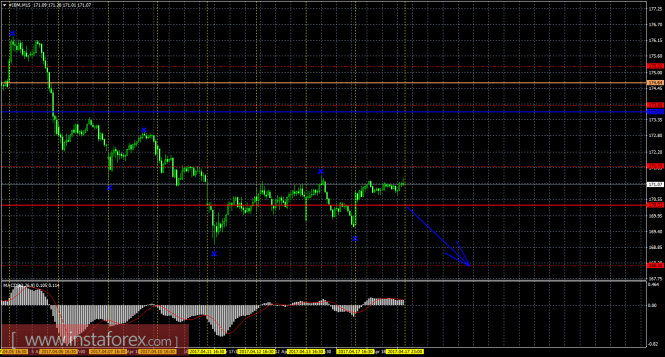 На младшем графике рекомендуется рассматривать ордера на продажу с целью 168,20 при открытии ниже 170,33 (Тенкан-сен), ордере Stop Loss выше 170,33 и при направленном вниз MACD.