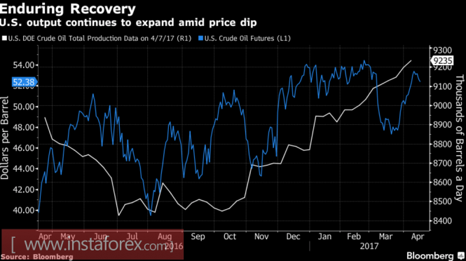 В настоящее время на рынке в качестве главных «бычьих» драйверов выступают слухи о возможном продлении сроков действия венского соглашения ОПЕК и потенциальное сокращение американских запасов. «Медведи» рассчитывают на рост добычи в Штатах и увеличение числа буровых установок от Baker Hughes. При этом повышение прогнозов по производству черного золота в США от трех наиболее авторитетных организаций позволяет продавцам использовать контратаки. Так, Управление энергетической информации ожидает роста показателя до 9,22 млн б/с (3,9% г/г) в 2017 году и до 9,9 млн б/с (+7,4% г/г) в 2018 году. ОПЕК в апреле спрогнозировала увеличение добычи на 540 тыс. б/с, что сразу на 200 тыс. б/с больше, чем в мартовском отчете. МЭА также рассчитывает на рост индикатора.