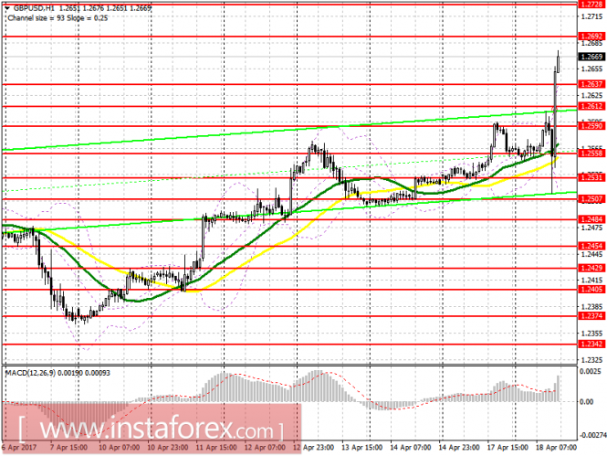 Заявления Терезы Мей и объявление о досрочных выборах в Великобритании спровоцировали крупные покупки британского фунта. Основной целью на сегодня по длинным позициям в GBP/USD является область 1.2692 и, вполне возможно, уровень 1.2728, где в рынок попытаются вернуться первые продавцы фунта. В случае нисходящей коррекции фунта рассчитывать на возврат в рынок покупателей можно от уровней 1.2637 и 1.2612.