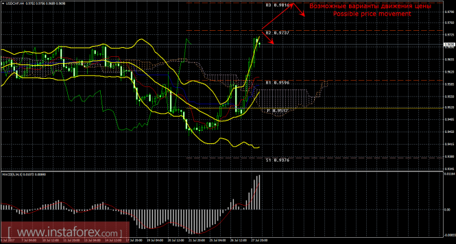 Красная линия и гистограмма с белыми барами в окне индикаторов.Материал предоставлен компанией InstaForex - www.instaforex.comТехнический анализ и торговые рекомендации по валютной паре USD/CHF на 28 июля 2017 года