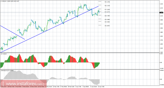 Анализ природного газа за 17 апреля показывает, что цена продолжает коррекционное движение, оба индикатора направлены наверх. На данный момент актуально нисходящее движение с целями уровни поддержки S2 – 3,1560 и S3 – 3,0960, если цена останется ниже 3,2170. Целями для продолжения восходящей коррекции выступают уровни 3,2550 и 3,3160. Восходящая линия тренда больше не поддерживает торгующих на повышение, так как цена закрепилась ниже нее. На данный момент актуальными являются ордера на продажу. Индикатор Awesome показывает локальное восходящее движение, последний закрытый бар окрашен в зеленый цвет. OsMA также направлен вверх, что сигнализирует о восходящем движении цены на газ и в более долгосрочном плане.