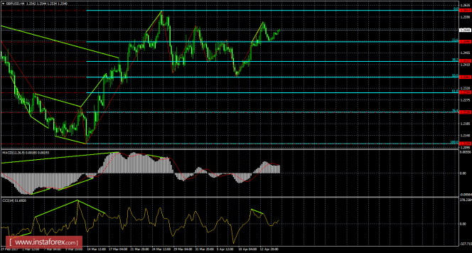 На 4-часовом графике пара выполнила отбой от уровня коррекции 23,6% - 1,2495 и разворот в пользу английской валюты. В итоге 17 апреля процесс роста котировок может быть продолжен в направлении коррекционного уровня 0,0% - 1,2614. Назревающих дивергенций сегодня не наблюдается ни у одного индикатора. Отбой котировок от уровня Фибо 0,0% сработает в пользу американской валюты и некоторого падения в направлении уровней коррекции 23,6% - 1,2495 и 38,2% - 1,2422. Закрепление пары над уровнем Фибо 0,0% повысит шансы на дальнейший рост и приведет к построению новой сетки Фибо-уровней.