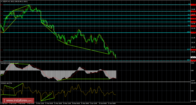 На 4-часовом графике бычья дивергенция у индикатора MACD позволила паре выполнить лишь малый рост, после чего последний дивергенционный лоу был пройден, а падение котировок было возобновлено в направлении уровня коррекции 200,0% - 107,85. Отбой курса 17 апреля от уровня Фибо 200,0% позволит рассчитывать на разворот в пользу валюты США и некоторый рост в направлении коррекционных уровней 161,8% - 109,32 и 100,0% - 111,69. Новых назревающих дивергенций сейчас не наблюдается. Закрепление пары под уровнем Фибо 200,0% сработает в пользу продолжения падения в направлении уровня коррекции 261,8% - 105,51.