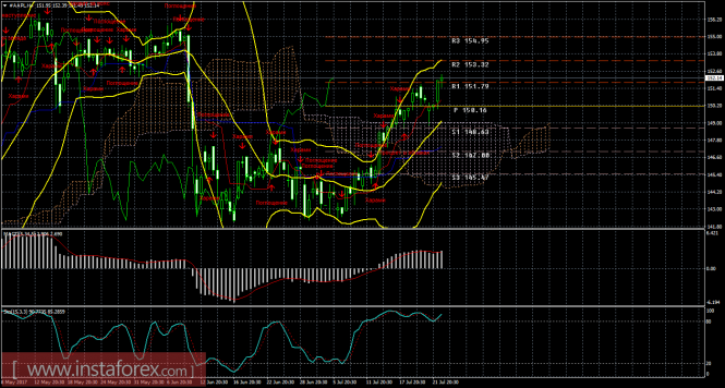 На младшем графике рекомендуется рассматривать ордера на продажу с целью 144,24 при закреплении цены ниже 149,98 (Тенкан-сен) и уровнем S/L выше 149,98. Разворот MACD наверх - коррекция. Учитывая очень далекое расположение линии Тенкан-сен, S/L лучше выставлять гораздо ниже.