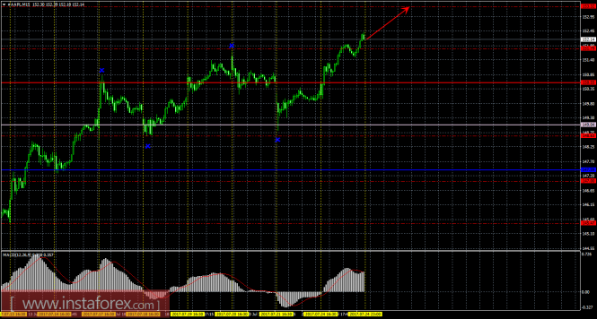 На 15-минутном графике рекомендуется рассматривать ордера на покупку с целью 153,32 при закреплении цены выше 151,79, ордером Stop Loss ниже 151,79. Разворот MACD вниз – виток коррекции.