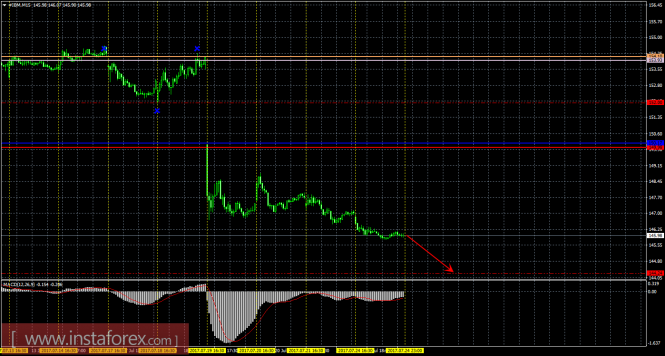 Цена акций IBM продолжает движение вниз. На текущем графике рекомендуется рассматривать шорты с целями 144,24 и 141,48. Стоп-лосс рекомендуется выставлять выше критической линии (150,17). Закрывать вручную ордера на продажу можно будет при развороте индикатора MACD наверх, при формировании бычьей модели(с подтверждением), а также при отскоке от уровня 144,24. Длинные позиции на данный момент не актуальны.