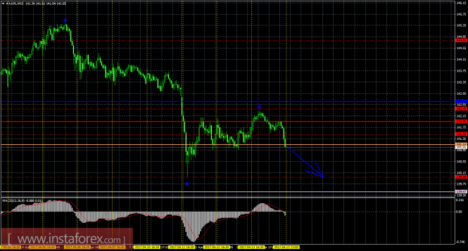 На 15-минутном графике рекомендуется рассматривать шорты с целью 139,99 при закреплении цены ниже 141,50, ордере Stop Loss выше 141,50 и при направленном вниз индикаторе MACD.