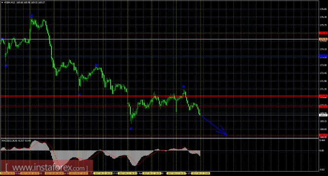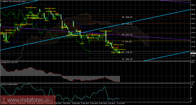 На младшем графике рекомендуется рассматривать ордера на продажу с целью 168,18 при открытии ниже 170,15, ордере Stop Loss выше 170,15. Разворот MACD вверх – виток локальной коррекции.
