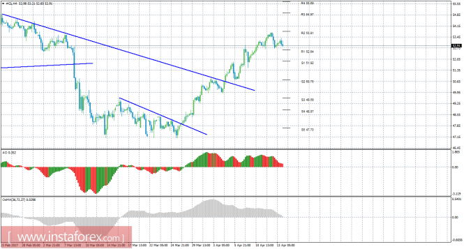 Уровни поддержки и сопротивления – красные горизонтальные линии.Материал предоставлен компанией InstaForex - www.instaforex.comТехнический анализ сырой нефти за 14 апреля 2017 года