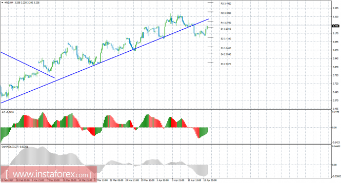 Анализ природного газа за 14 апреля показывает, что цена закрепилась ниже восходящей линии тренда и сразу же начала коррекционное движение. На данный момент актуально нисходящее движение с целями уровни поддержки S2 – 3,1340 и S3 – 3,0480, если цена отскочит от 3,2210. Целями для продолжения восходящей коррекции выступают уровни 3,2750 и 3,3620. Восходящая линия тренда больше не поддерживает торгующих на повышение, так как цена закрепилась ниже нее. На данный момент актуальными являются ордера на продажу. Индикатор Awesome показывает локальное восходящее движение, последний закрытый бар окрашен в зеленый цвет. OsMA также развернулся вверх, что сигнализирует о восходящем движении цены на газ и в более долгосрочном плане. Отскок цены от уровня 3,2210 может засвидетельствовать окончание коррекции.