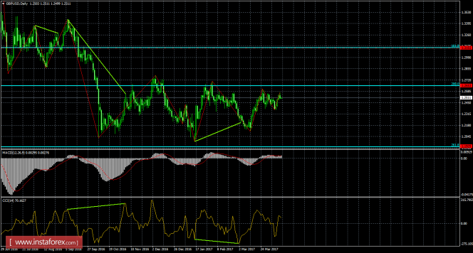 На 4-часовом графике пара выполнила разворот в пользу валюты США после образования медвежьей дивергенции, и выполнила падение к коррекционному уровню 23,6% - 1,2495. Медвежья дивергенция у индикатора CCI: пик индикатора и пики котировок не совпадают между собой. Отбой курса пары 14 апреля от уровня Фибо 23,6% позволит рассчитывать на разворот в пользу валюты Англии и некоторый рост в направлении уровня коррекции 0,0% - 1,2614. Закрепление пары под уровнем коррекции 23,6% сработает в пользу дальнейшего падения в направлении следующего уровня Фибо 38,2% - 1,2422.