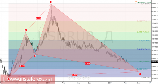 Если «медведи» сумеют взять штурмом поддержку на 56,46 и закрепиться ниже ее, то риски реализации таргета на 88,6% по паттерну «Акула» продолжат увеличиваться. Он расположен вблизи 52 рублей за доллар США.