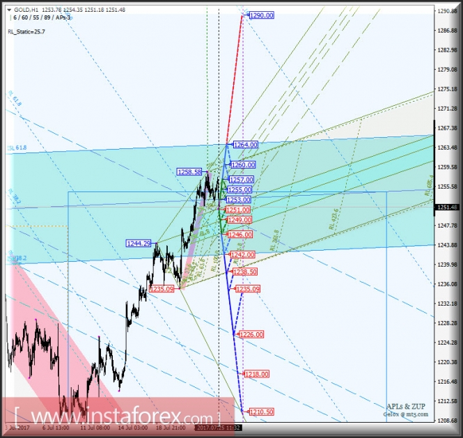 Развитие движения цены инструмента (Gold Spot) в период 25 июля - 01 августа 2017 г. будет обусловлено отработкой границ канала 1/2 Median Line (1257.00 <-> 1255.00 <-> 1253.00) и зоны равновесия (1251.00 <-> 1249.00 <-> 1246.00) вил операционного масштаба Micro.