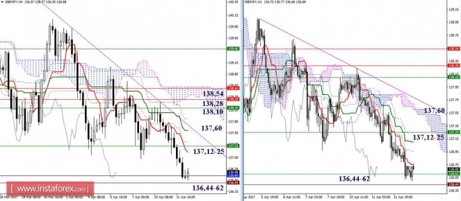 Сейчас встречены поддержки 136,44-62. В сложившейся ситуации закрепление выше 136,75 (Тенкан Н1) послужит началом восходящей коррекции на младших таймфреймах. Первым ориентиром при этом будет являться 137,12-25 (Тенкан Н4 + Киджун Н1 + недельный Киджун), далее нужно отметить 137,60 (Киджун Н4 + облако Н1). Наиболее укреплённая и значимая зона сопротивлений по-прежнему расположена в облаке Н4, которое усилено скоплением уровней старших временных интервалов (138,10-28-54).