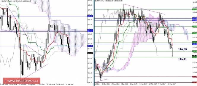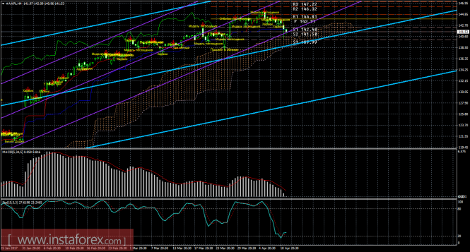 Индикатор MACD – красная линия и гистограмма с белыми барами в окне индикаторов.Материал предоставлен компанией InstaForex - www.instaforex.comДневной обзор GBP/JPY и EUR/JPY на 12.04.17. Индикатор Ишимоку