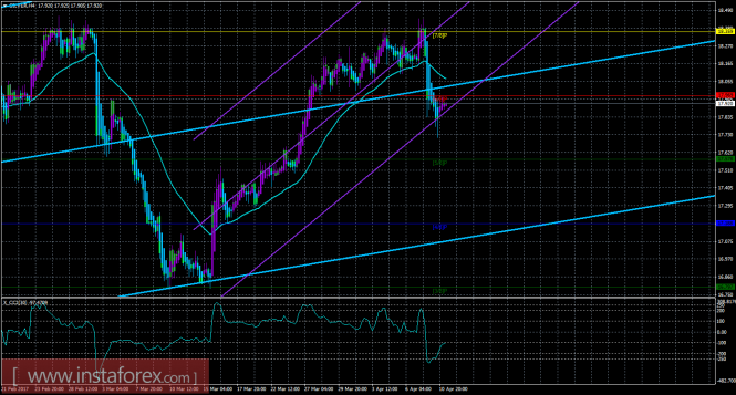 Из анализа серебра 11 апреля следует, что цена начала восходящую коррекцию после закрепления ниже мувинга. Старший канал направлен вверх, что свидетельствует о восходящем направлении движения глобального тренда. Младший канал также направлен вверх, что означает восходящее движение и в менее долгосрочном плане. В данный момент цена находится ниже мувинга и ниже уровня Мюррея «6/8», что делает более вероятным продолжение нисходящего движения. Первой целью для движения вниз сейчас является уровень Мюррея «5/8» - 17,578, но шорты сейчас не являются актуальными. Если цена преодолеет этот уровень, то новой целью будет выступать уровень Мюррея «4/8» - 17,188. Скользящая средняя направлена вниз, а цена располагается ниже нее, что сигнализирует о текущем нисходящем направлении движения. Ордера на продажу станут актуальными не раньше разворота вниз хотя бы одного канала. Лонги можно будет рассматривать только после закрепления выше скользящей средней. Хайкен Аши окрасил последние бары в фиолетовый цвет, что сигнализирует о внутридневном движении вверх, однако при любой направленности индикатора шорты сейчас не актуальны. Окрас 1-2 баров в голубой цвет укажет на окончание коррекции. Индикатор CCI находится около уровня -100, что сигнализирует о наличии слабой перепроданности инструмента.